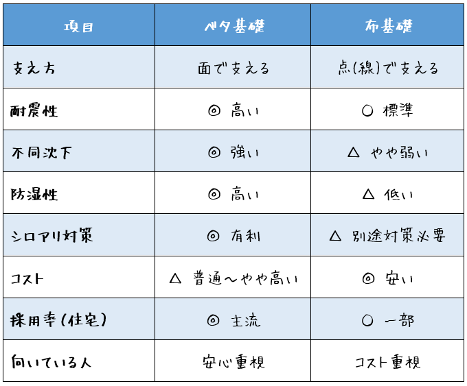 一般住宅において、基礎は大きく「布基礎」と「ベタ基礎」の2つに分けられます。